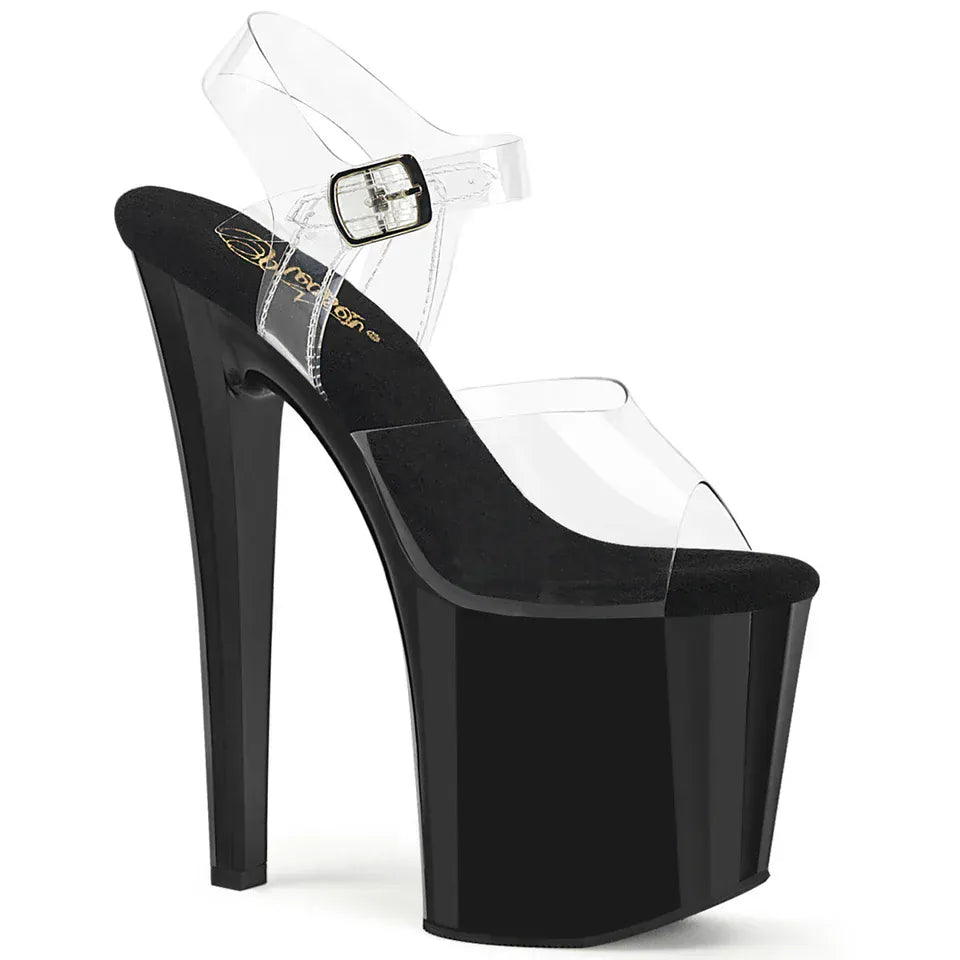 Step into the spotlight with the Enchant-708 Ankle Strap Sandal. Featuring a jaw-dropping 7 1/2-inch heel and a substantial 3 1/2-inch platform, these sandals exude pure glamour. The prismatic linear design at the platform front and back of the heel creates a dazzling effect, making every step a showstopper. The clear upper design adds a modern, sleek touch, perfect for those who love to stand out in style. Whether you're hitting the dance floor or attending a special event, the Enchant-708 adds the perfect touch of sparkle.